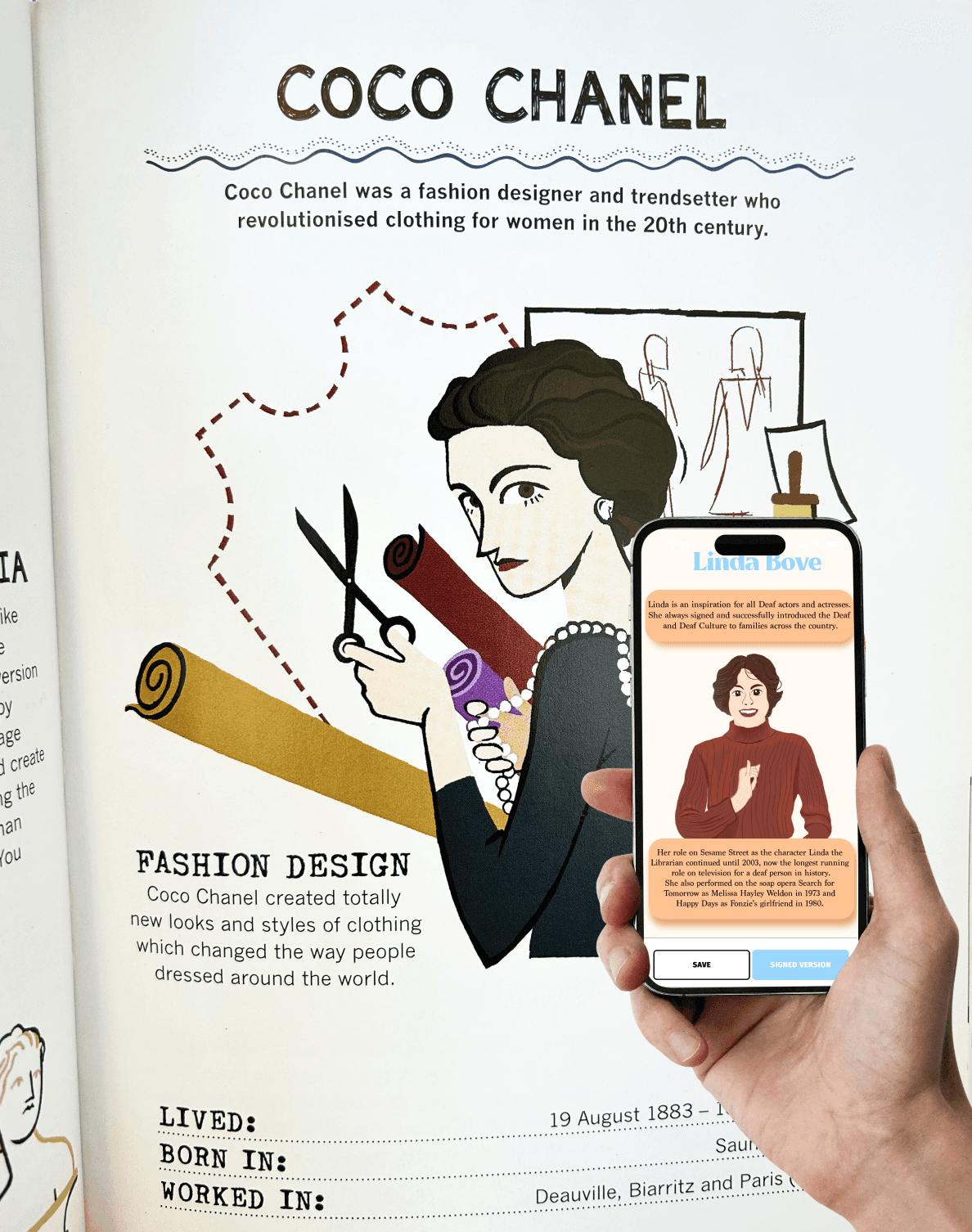 I used illustrations as the pop-up images at the first stage of scanning the book-page, as well as the signed translation detailed pages in the app, to engage with users in an uplifting way and get them excited to engage with the deaf stories.